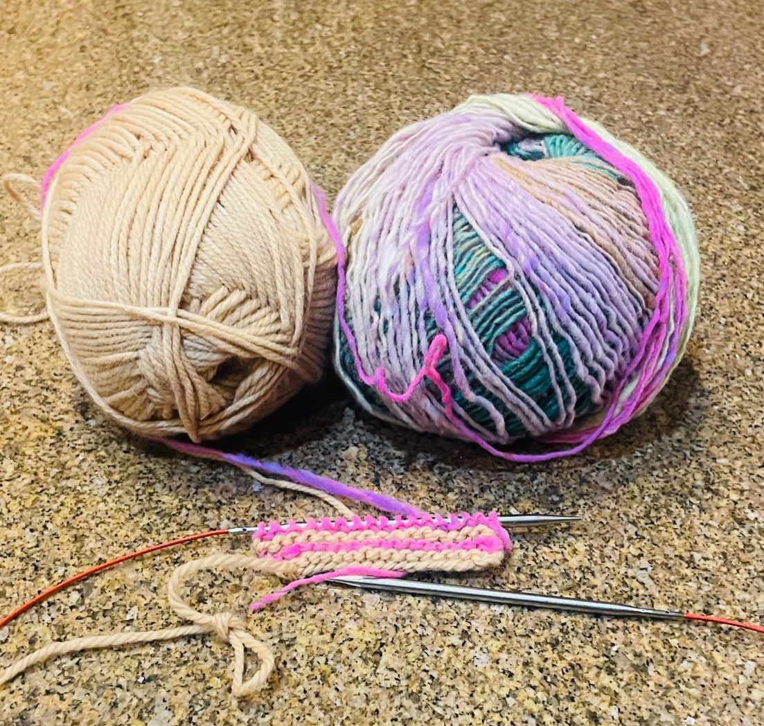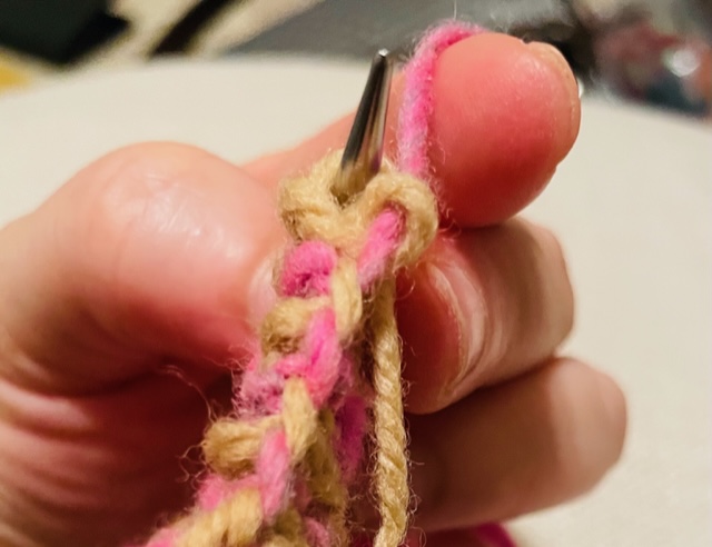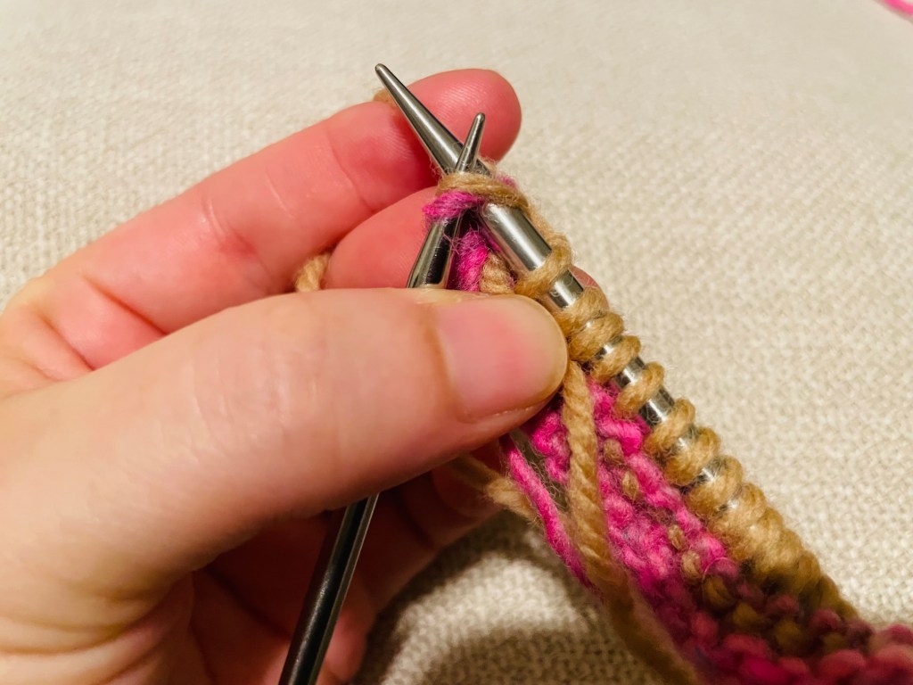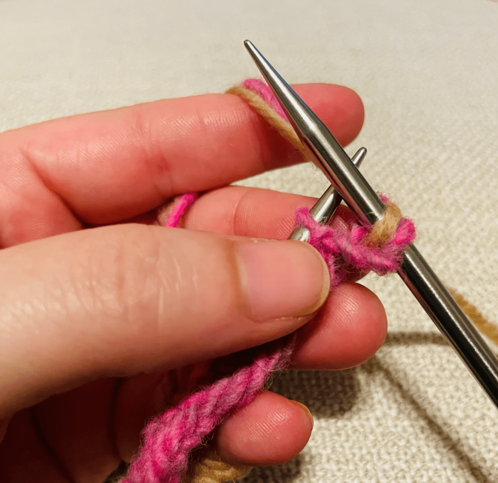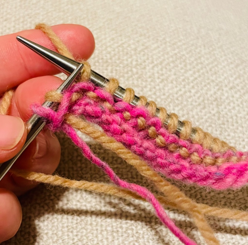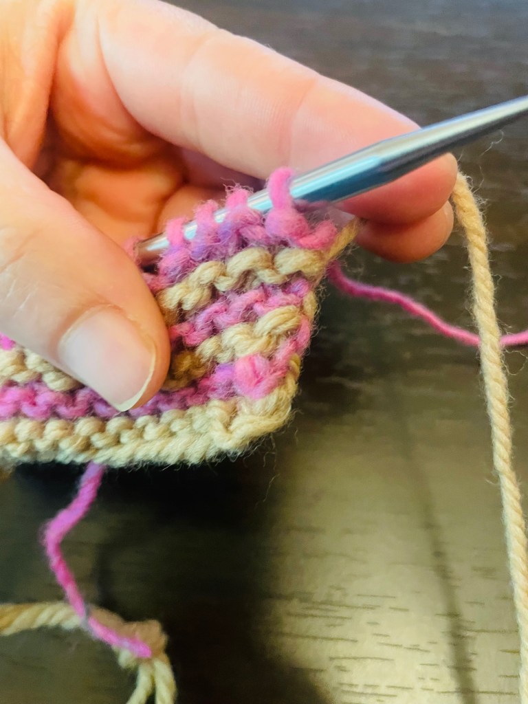 Row 3 (RS): Grab the yarn in the old color (light brown, CA) and hold it together with the new color (pink, CB) new color.
