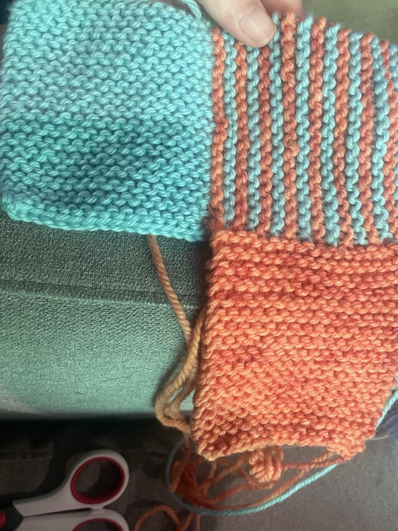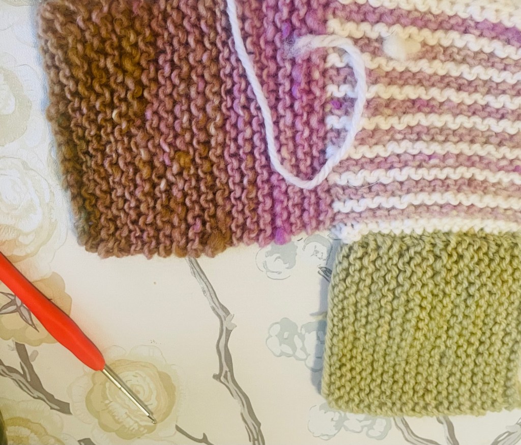 If you haven’t finished all your squares, this is a good technique to try out. You’ll use it countless times in knitting patterns. When done correctly is virtually invisible. You will still need to do a bit of seaming at the end for a few sides, but it will be minimal. This is how it works: