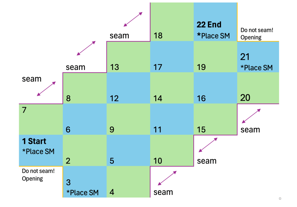 The chart below illustrates the placement of each square. Arrange your squares according to the chart. I recommend snapping a picture of the layout for future reference, to ensure you remember the intended arrangement.