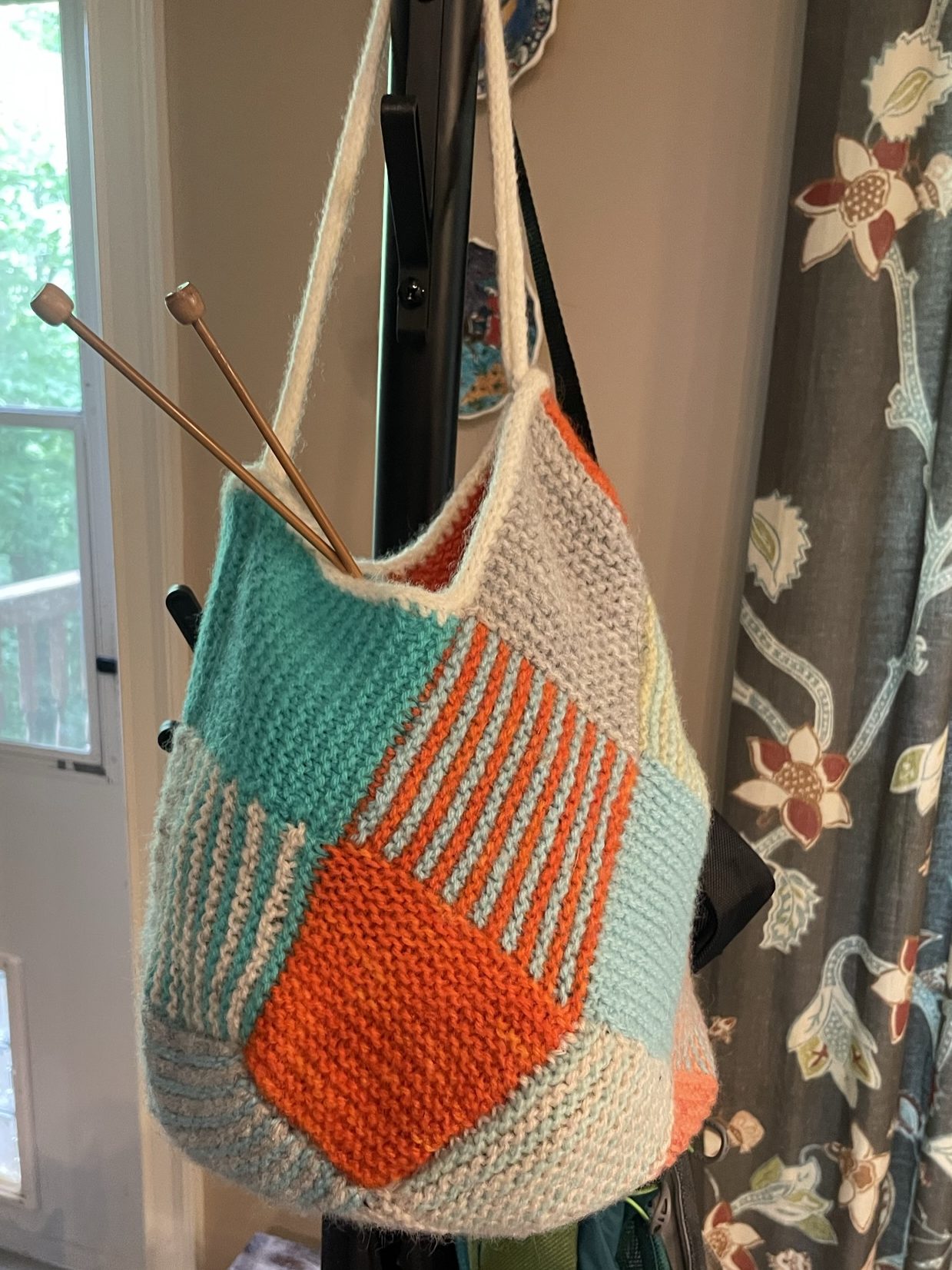 Starting with the front of the bag, and with the RS of the fabric facing you, pick up and knit 35 stitches in the front opening: 17 st from squares #1 and #3, and 1 st from square #2 (striped square). *These are the squares where you placed your stitch markers.