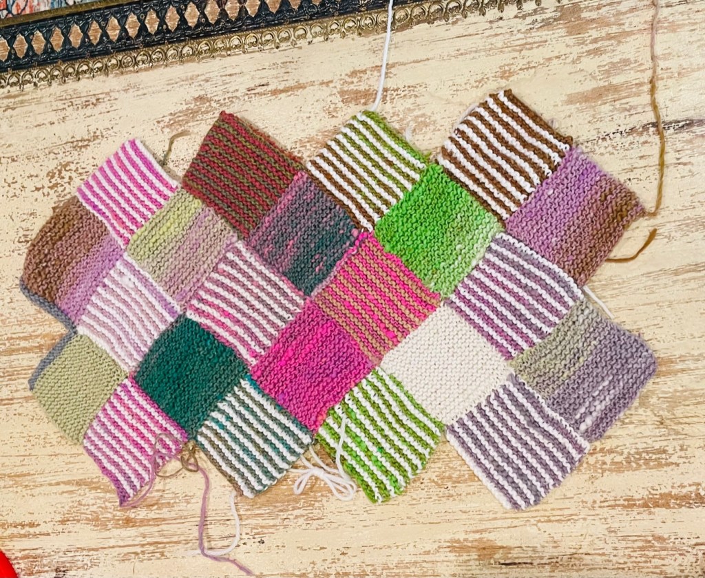 First, start by laying out the all the seamed squares on a table or on the floor so you can see more clearly which sides to seam. After you seam the first two squares, the bag will begin taking a 3D shape, don’t think you made a mistake, that’s what we want. Note that in the picture below, I decided to make 12 striped squares and 10 solid color squares, but the concept is the same.