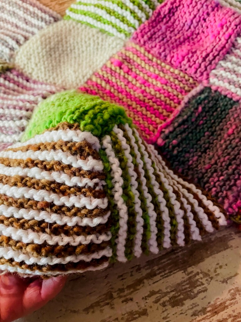 Now that you’ve joined all the squares, you’re ready to knit and add the strap, knit the edging and felt your bag.