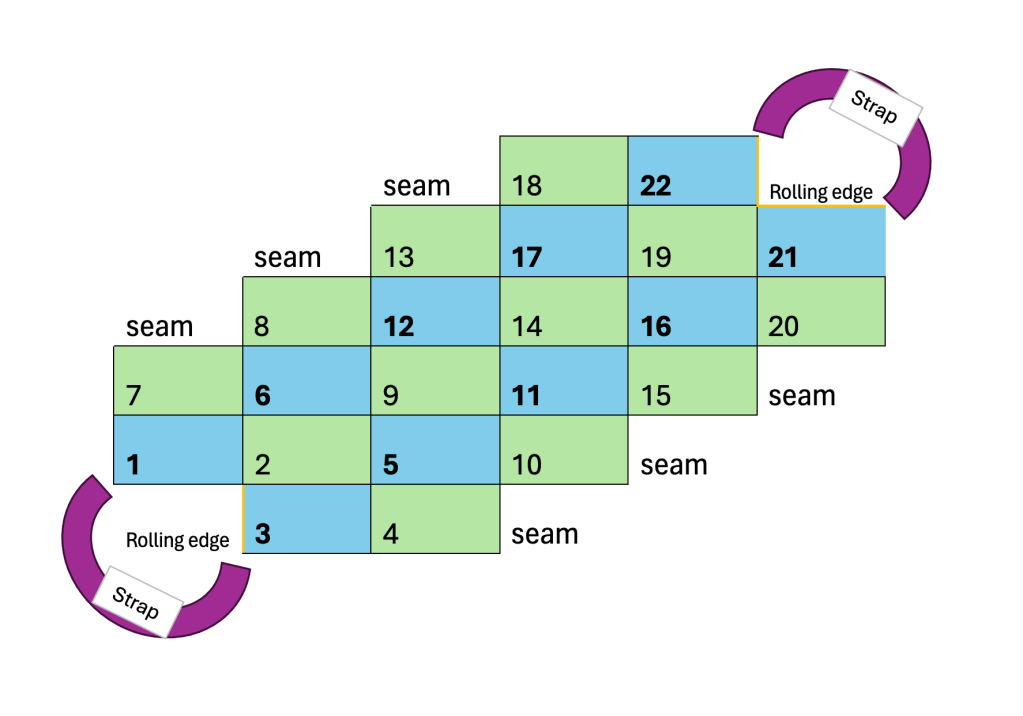 As you can see, the bag starts taking a 3D shape as soon as you seam those first two squares. Keep seaming your squares following the graphic above. Remember to not seam the two openings. I loved seeing how the bag folded into the right shape as I seamed the second square. After that I became very clear how all the pieces worked together.